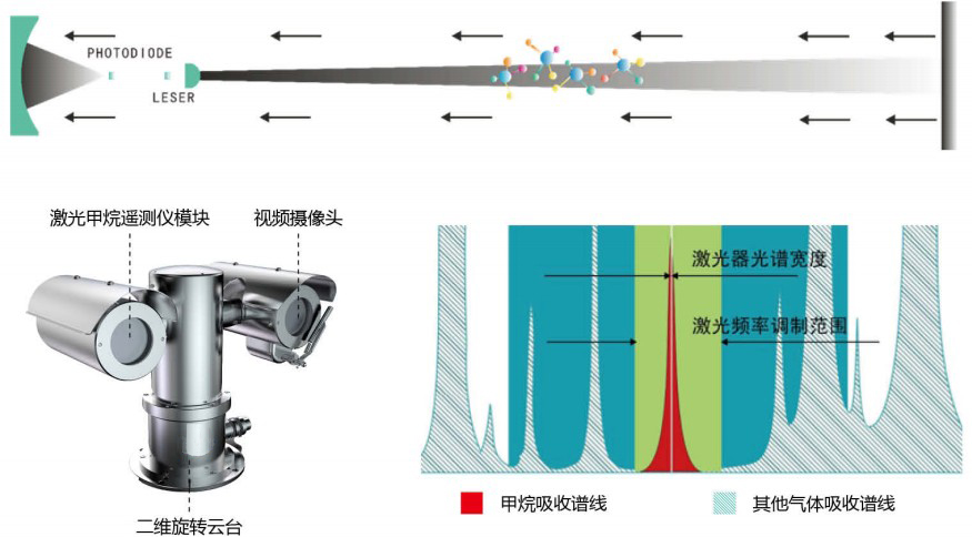 ·遥测仪发射出的激光通过天然气泄漏气团时,甲烷气体会对该激光产生吸收,吸收后的激光通过漫反射被探测器接收,经过数据采集和处理得出甲烷气体泄漏的浓度信息,该浓度信息用甲烷柱体密度(ppm*m)表示:甲烷浓度(ppm)*气团厚度(m)